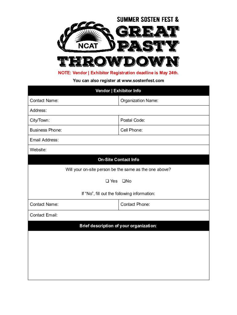 NOTE: Vendor Exhibitor Registration deadline is May 24th. You can also register at www.sostenfest.com Vendor Exhibitor Info Contact Name:Organization Name:Address: City/Town:Postal Code:Business Phone:Cell
