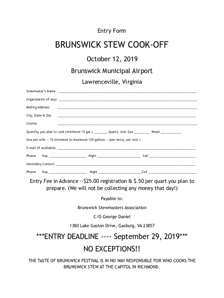 Entry FormBRUNSWICK STEW COOKOUT October 12, 2019, Brunswick Municipal Airport Lawrenceville, Virginia Stew masters Name Organization (if any) Mailing Address: City, State & Zip: County: Quantity