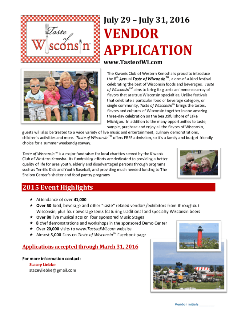 July 29 July 31, 2016VENDOR APPLICATION www.TasteofWI.com The Kiwanis Club of Western Kenosha is proud to introduce the 8th Annual Taste of Wisconsin TM, an oneofakind festival celebrating the best