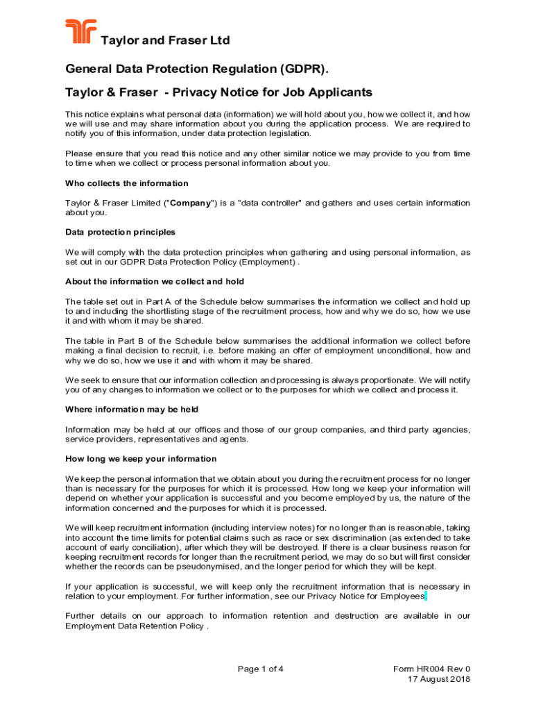 Taylor and Fraser Ltd General Data Protection Regulation (GDPR). Taylor & Fraser Privacy Notice for Job Applicants This notice explains what personal data (information) we will hold about you, how