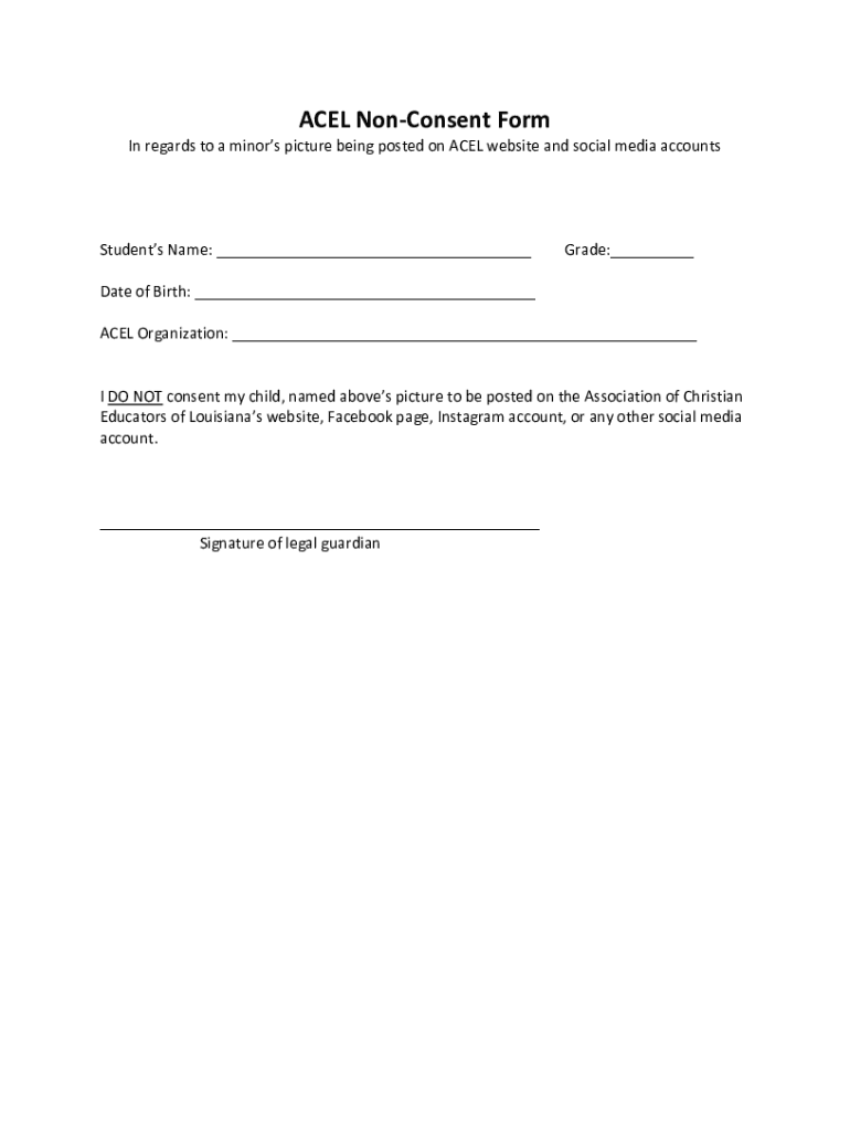 ACE Consent Forming regards to a minors picture being posted on ACE website and social media accountsStudents Name: Grade: Date of Birth: ACE Organization: I DO NOT consent my child, named above picture