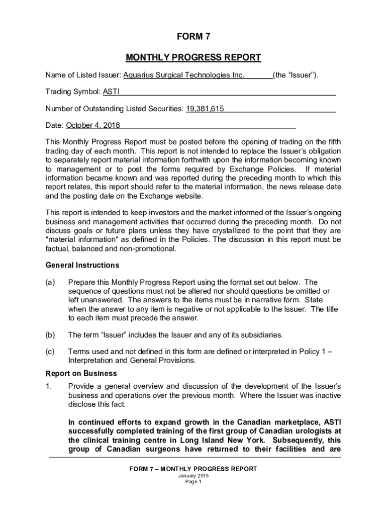 Name of Listed Issuer: Aquarius Surgical Technologies Inc.(the Issuer). Trading Symbol: ANTI