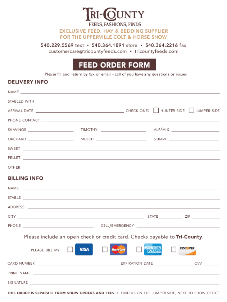 EXCLUSIVE FEED, HAY & BEDDING SUPPLIER FOR THE NAPERVILLE COLT & HORSE SHOW 540.229.5569 text 540.364.1891 store 540.364.2216 fax customer care tricountyfeeds.com tricountyfeeds. Complete fill and
