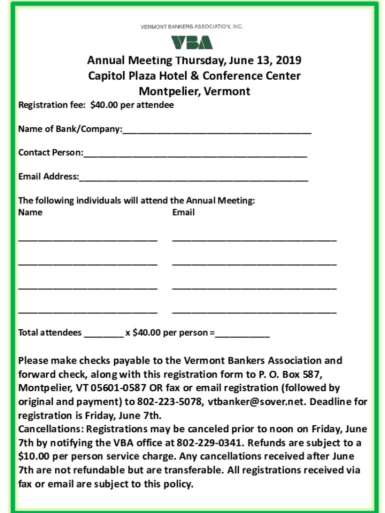 The Officers, Executive Council and staff of the Vermont Bankers Association, Inc. cordially invite you to our ANNUAL MEETING Thursday, June 13, 2019, Capitol Plaza Hotel & Conference Center Montpelier,