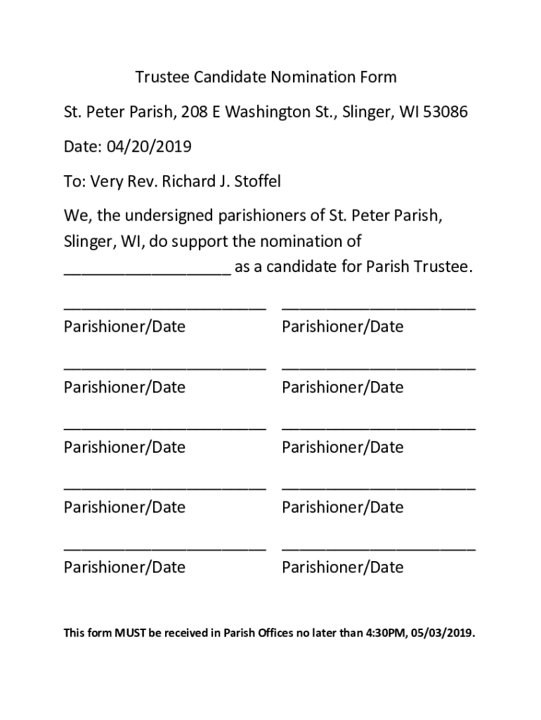 Trustee Candidate Nomination Form St. Peter Parish, 208 E Washington St., Singer, WI 53086 Date: 04/20/2019 To: Very Rev. Richard J. Staffed We, the undersigned parishioners of St. Peter Parish, Singer,