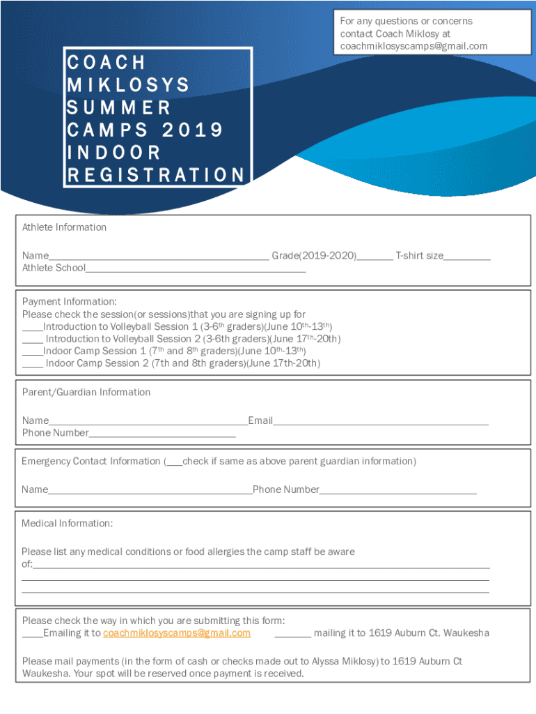 COACH MIKLÓS SUMMER CAMPS 2019 INDOOR R E G I ST R AT I ON For any questions or concerns contact Coach Miklós at coachmiklosyscamps Gmail. Complete Information Name Grade(20192020) Shirt size Athlete