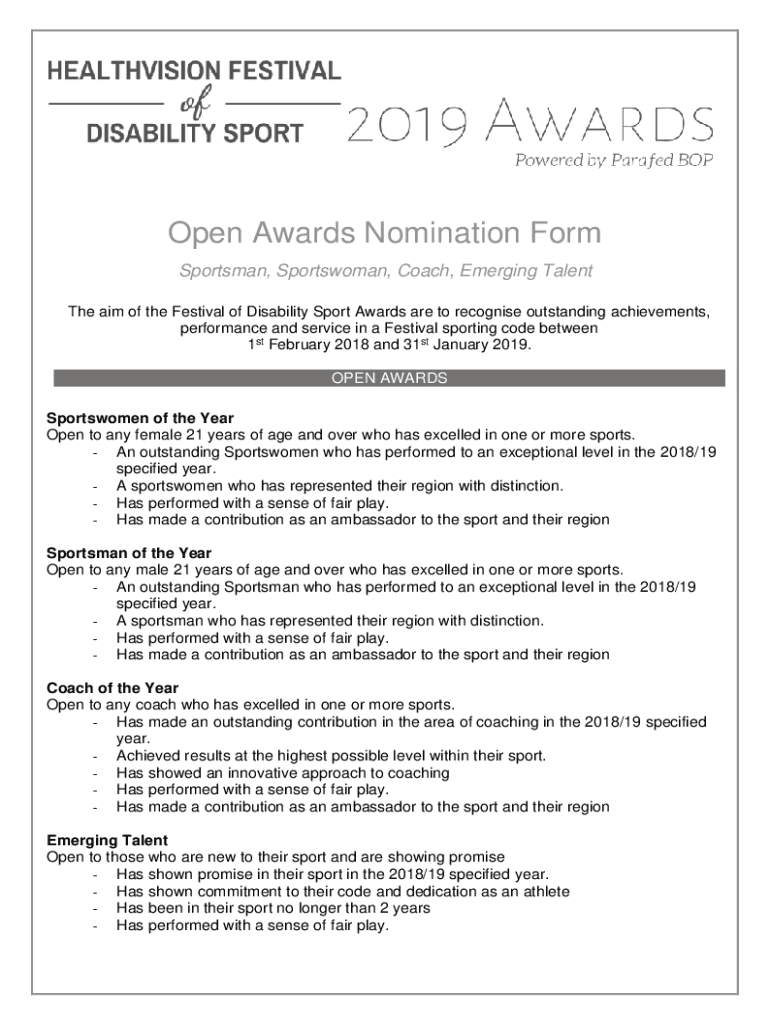 Open Awards Nomination Form Sportsman, Sportswoman, Coach, Emerging Talent The aim of the Festival of Disability Sport Awards are to recognize outstanding achievements, performance and service in
