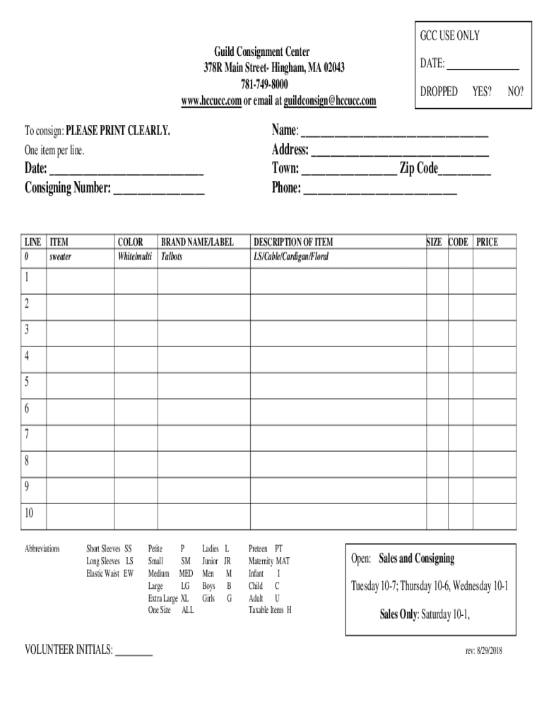 GCC USE ONLY Guild Consignment Center 378R Main Street Gingham, MA 02043 7817498000 www.hccucc.com or email at guild consign hccucc.com To consign: PLEASE PRINT CLEARLY. One item per line. Date: Consigning
