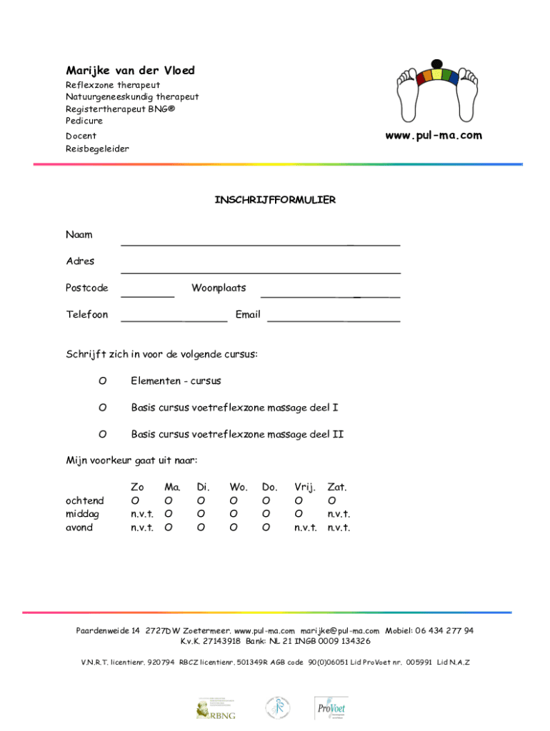 Marine van der Led Reflex zone therapeutic Natuurgeneeskundig therapeutic Registertherapeut BNG Pedicure.puma.component ReisbegeleiderINSCHRIJFFORMULIER Nam Acres PostcodeWoonplaatsTelefoonEmailSchrijft