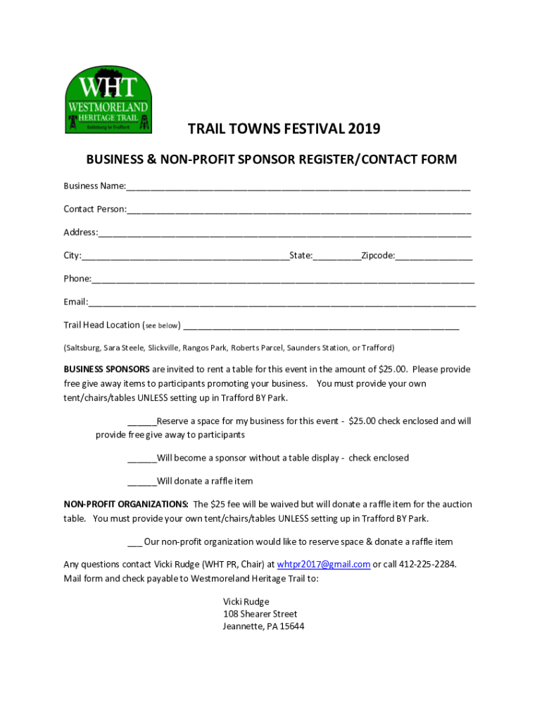 TRAIL TOWNS FESTIVAL 2019 BUSINESS & NONPROFIT SPONSOR REGISTER/CONTACT FORM Business Name: Contact Person: Address: City: State: Zip code: Phone: Email: Trail Head Location (see below) (Salts burg,
