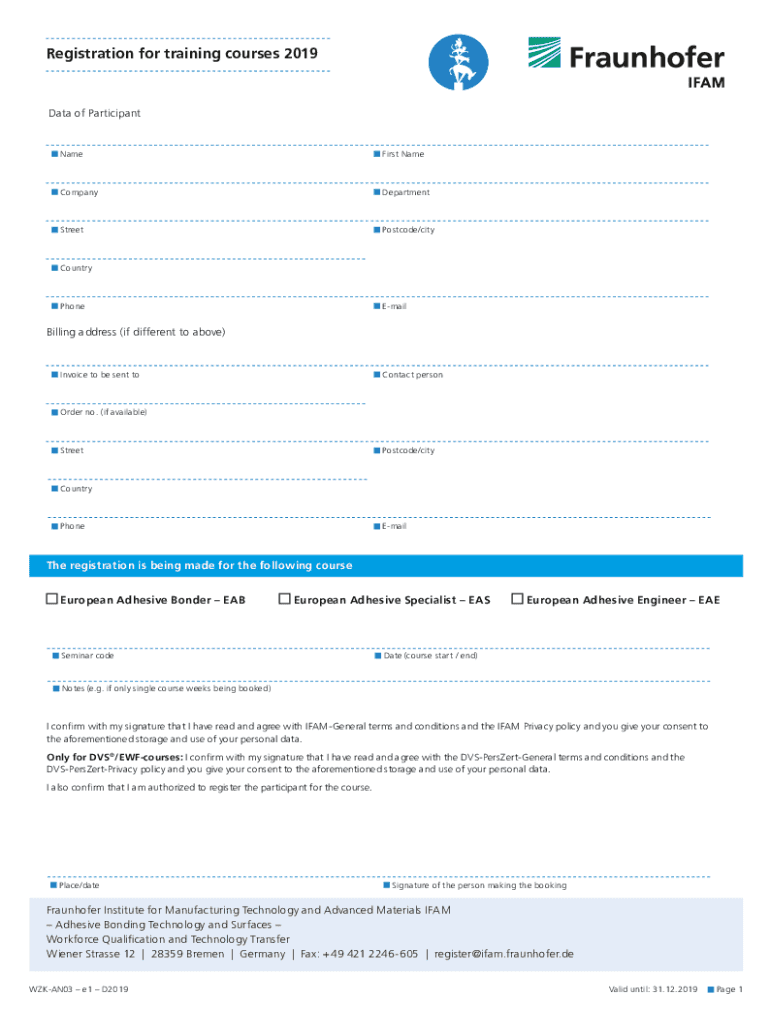 Registration for training courses 2019Data of ParticipantNameFirst NameCompanyDepartmentStreetPostcode/cityCountryPhoneEmailBilling address (if different to above)Invoice to be sent contact personOrder