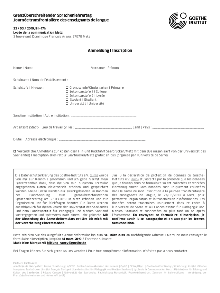 Grenzberschreitender Sprachenlehrertag Journey transfrontalire DES enseignants de large 23 / 03 / 2019, 9h17h Lace DE la communication Metz 3 boulevard Dominique Francis Aragon, 57070 MetzAnmeldung