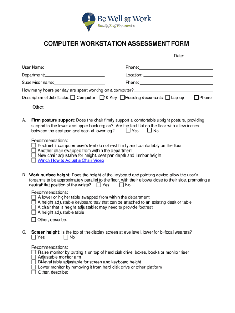 COMPUTER WORKSTATION ASSESSMENT FORM Date: Username:Phone:Department:Location:Supervisor name:Phone:How many hours per day are spent working on a computer? Description of Job Tasks:Computer10KeyReading