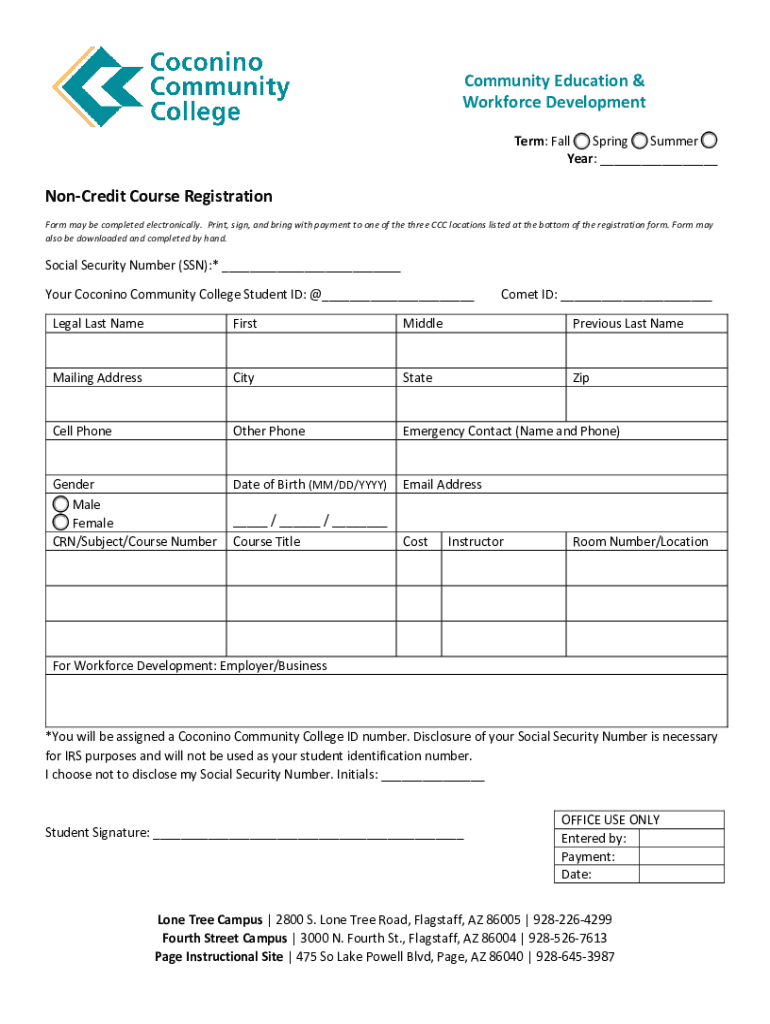 Community Education & Workforce Development Term: Fall Spring Summer Year: Noncredit Course Registration Form may be completed electronically. Print, sign, and bring with payment to one of the three