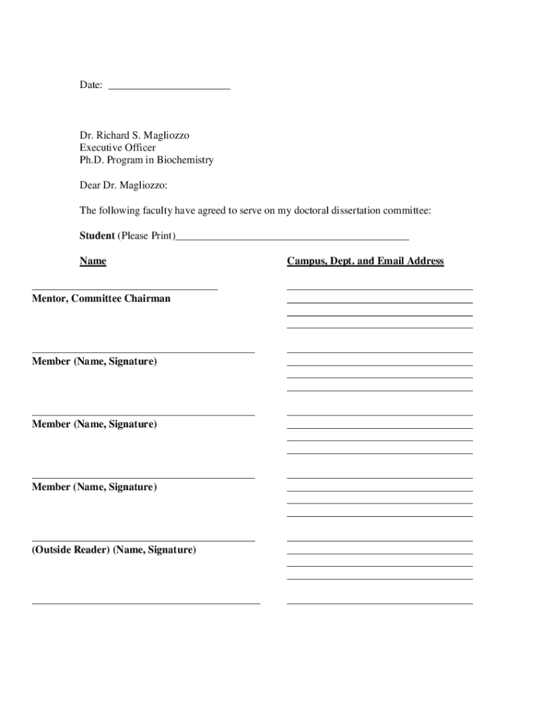 Date: Dr. Richard S. Magliozzo Executive Officer Ph.D. Program in Biochemistry Dear Dr. Magliozzo: The following faculty have agreed to serve on my doctoral dissertation committee: Student (Please