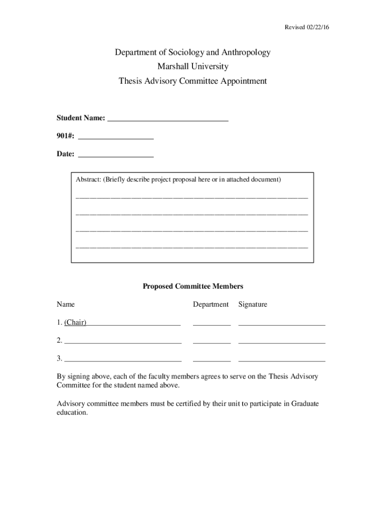 Revised 02/22/16Department of Sociology and Anthropology Marshall University Thesis Advisory Committee AppointmentStudent Name: 901#: Date: Abstract: (Briefly describe project proposal here or in