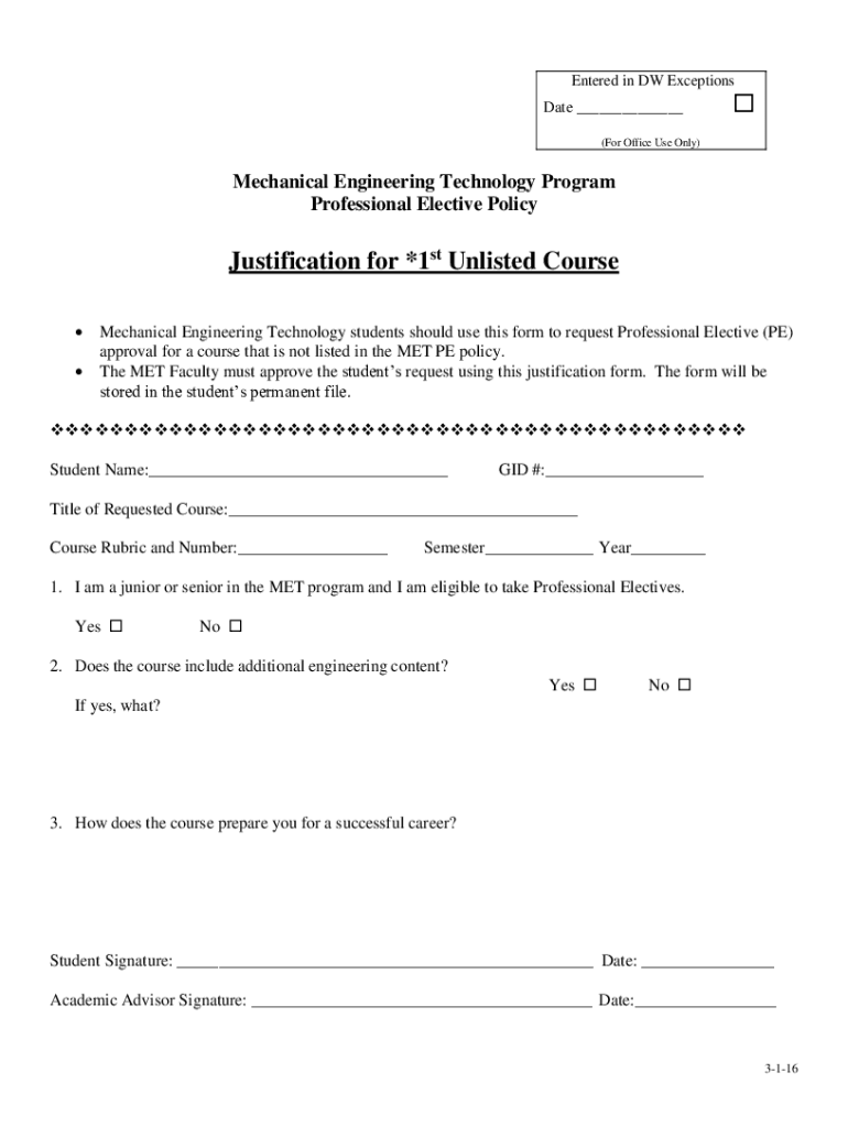Entered in DW Exceptions Date (For Office Use Only)Mechanical Engineering Technology Program Professional Elective PolicyJustification for *1st Unlisted Course Mechanical Engineering Technology students