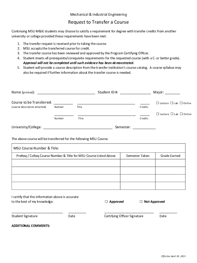 Mechanical & Industrial EngineeringRequest to Transfer a Course Continuing MSU MIE students may choose to satisfy a requirement for degree with transfer credits from another university or college