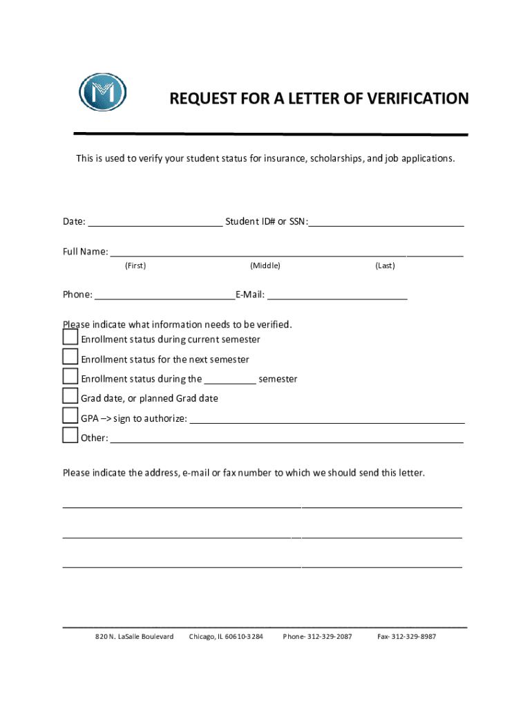 REQUEST FOR A LETTER OF Verifications is used to verify your student status for insurance, scholarships, and job applications. Date: Student ID# or SSN: Full Name: (First)(Middle)(Last)Phone: Email: