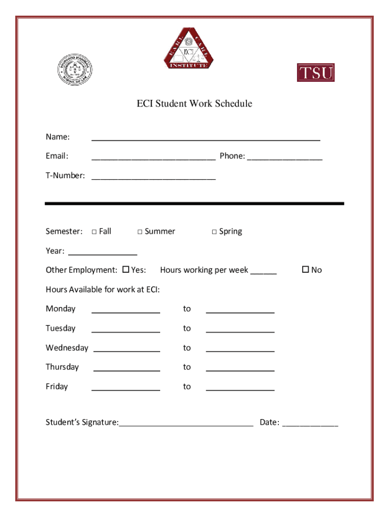 PCI Student Work Schedule Name: Email: Phone: Number: Semester: Fall Summer Springier: Other Employment: Yes:Hours working per week Hours Available for work at PCI: MondaytoTuesdaytoWednesdaytoThursdaytoFridaytoStudents