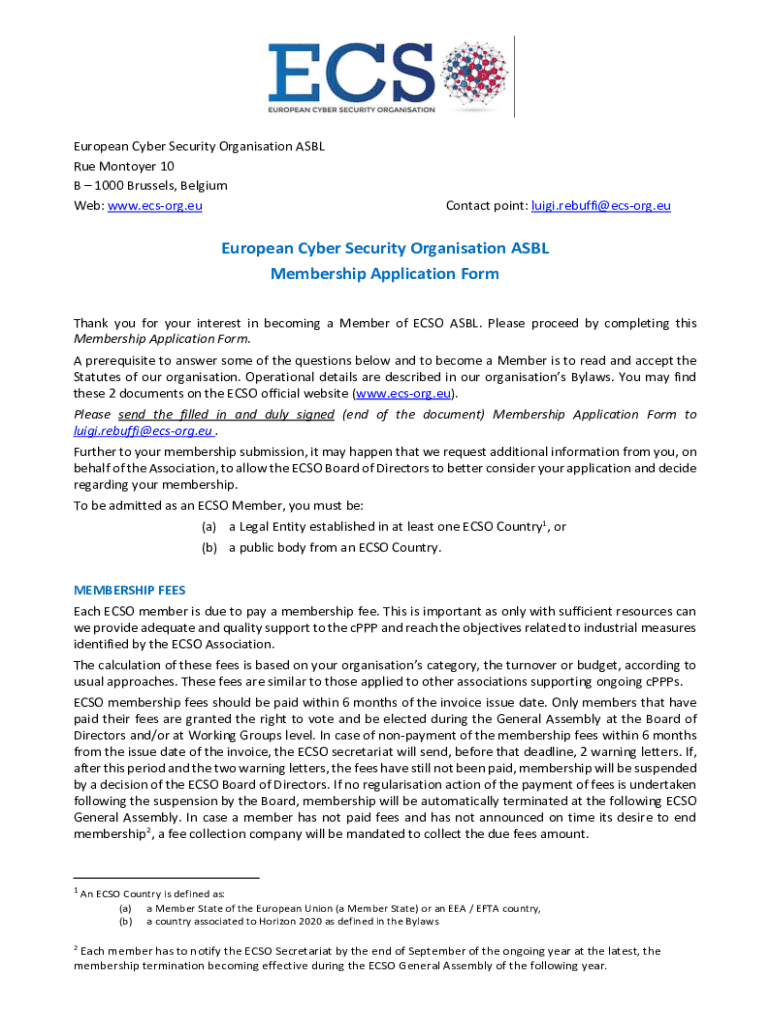 European Cybersecurity Organization ASBL Rue Monomer 10 B 1000 Brussels, Belgium Web: www.ecsorg.euContact point: Luigi. Rebuffs escort. European Cybersecurity Organization ASBL Membership Application