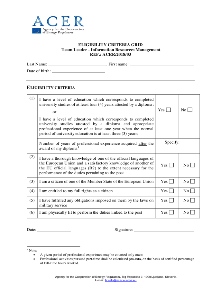 Get the free ELIGIBILITY CRITERIA GRID Team Leader - Information ...