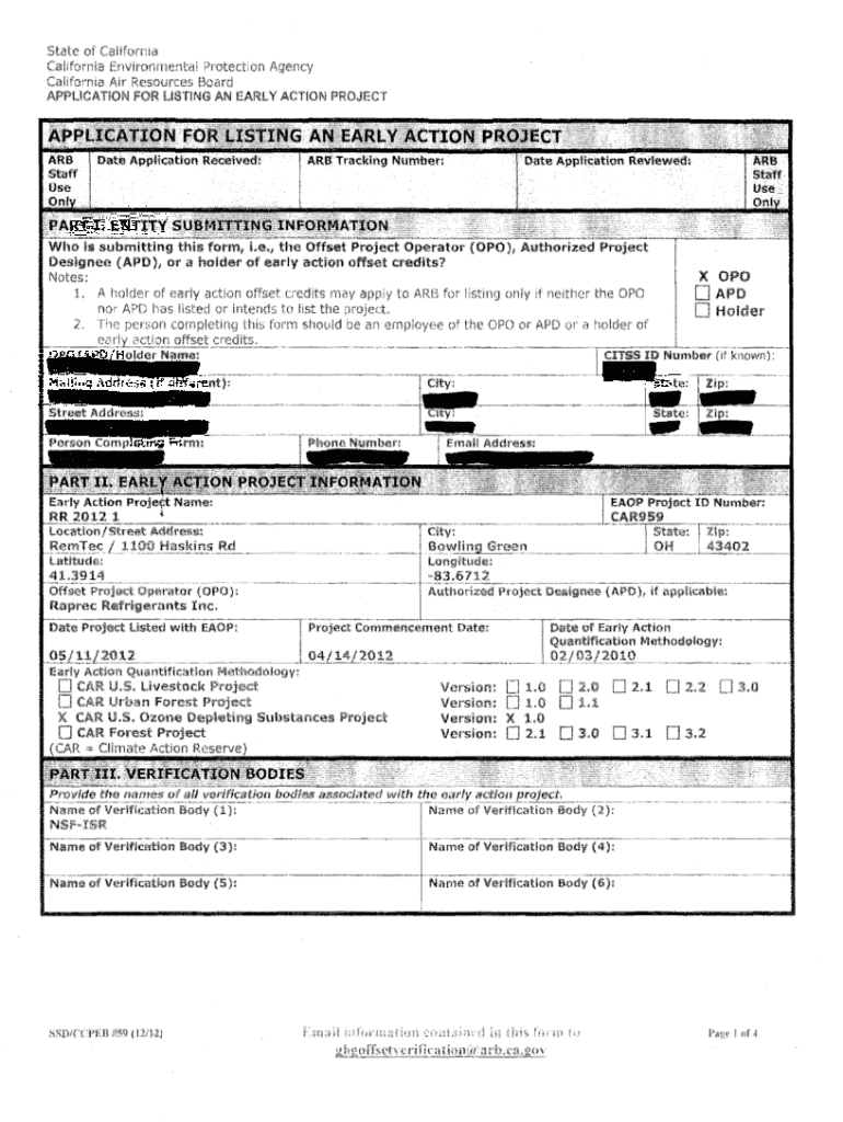 State of California Environmental Protection Agency California Air Resources BoardAPPLICATION FOR LISTING AN EARLY ACTION PROJECT ARB Date Application Received Staff Use Unix. Date Application Reviewed;ARB