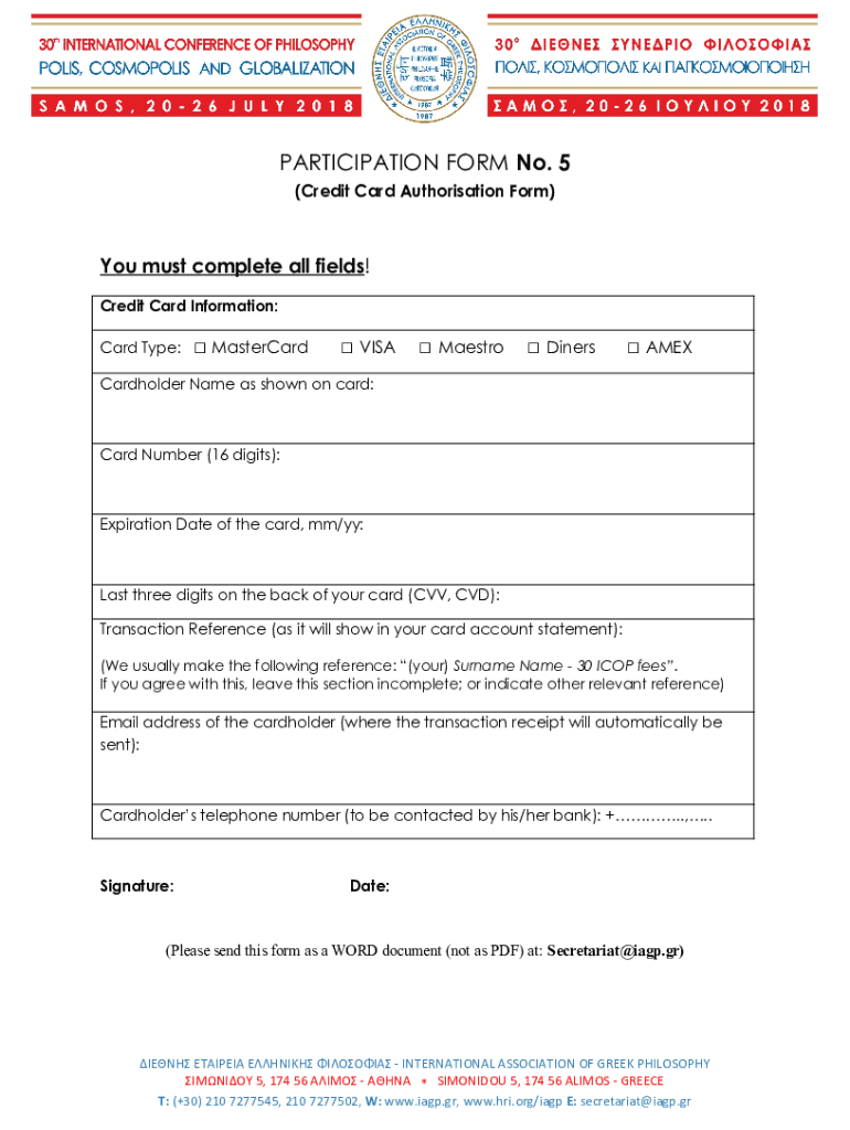PARTICIPATION FORM No. 5 (Credit Card Authorization Form)You must complete all fields! Credit Card Information: Card Type: MasterCard VISA Maestro Diners AMEXCardholder Name as shown on card:Card