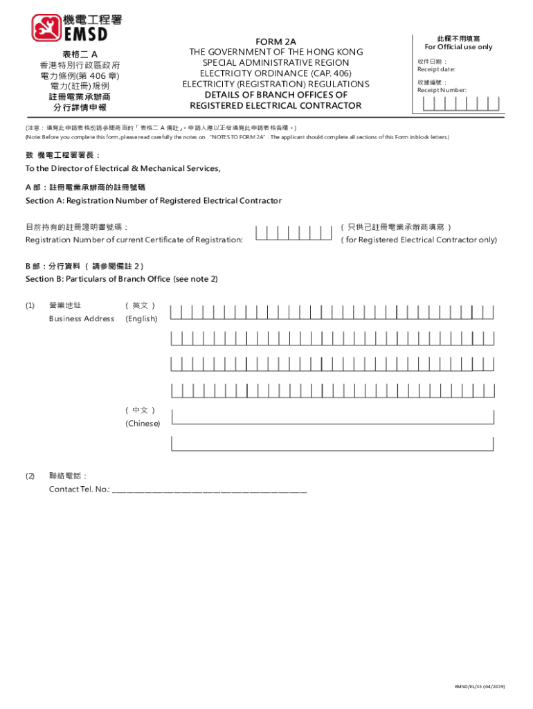 FORM 2A THE GOVERNMENT OF THE HONG KONG SPECIAL ADMINISTRATIVE REGION ELECTRICITY ORDINANCE (CAP. 406) ELECTRICITY (REGISTRATION) REGULATIONS DETAILS OF BRANCH OFFICES OF REGISTERED ELECTRICAL CONTRACTOR