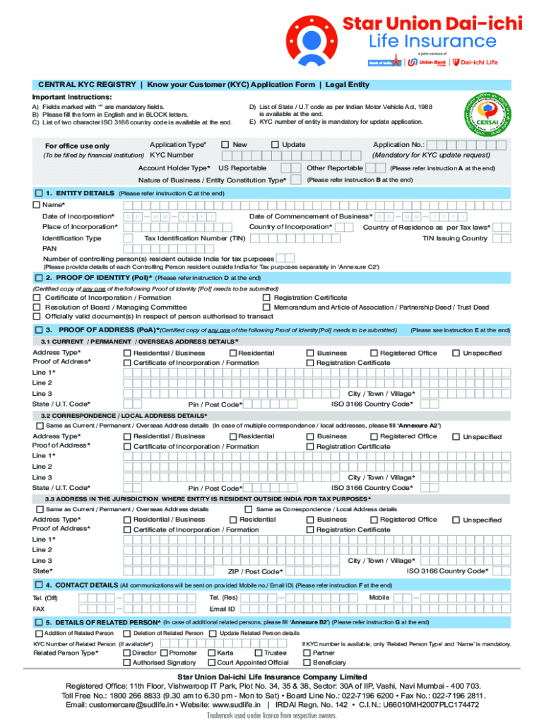 CENTRAL KYC REGISTRY Know your Customer (KYC) Application Form Legal Entity Important Instructions: A) Fields marked with * are mandatory fields. B) Please fill the form in English and in BLOCK letters.