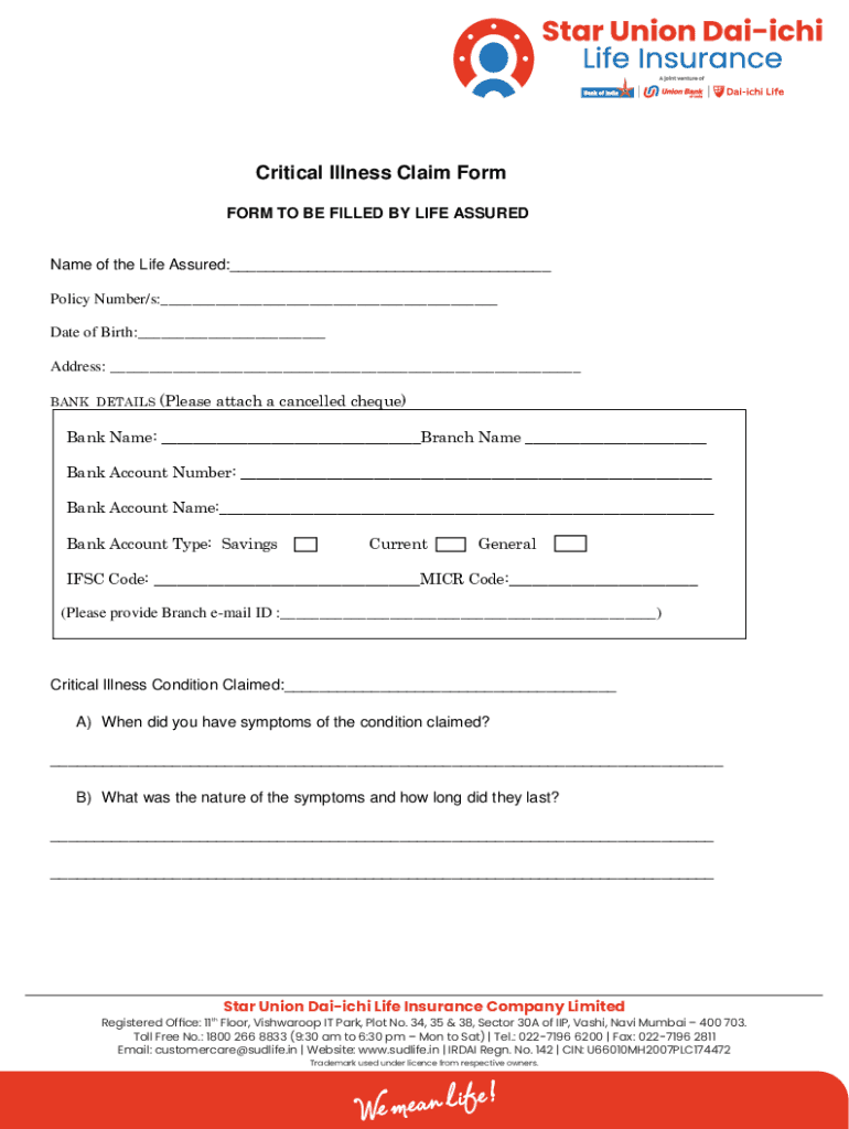 Critical Illness Claim Form TO BE FILLED BY LIFE ASSUREDName of the Life Assured: Policy Number/s: Date of Birth: Address: BANK DETAILS (Please attach a cancelled check)Bank Name: Branch Name Bank