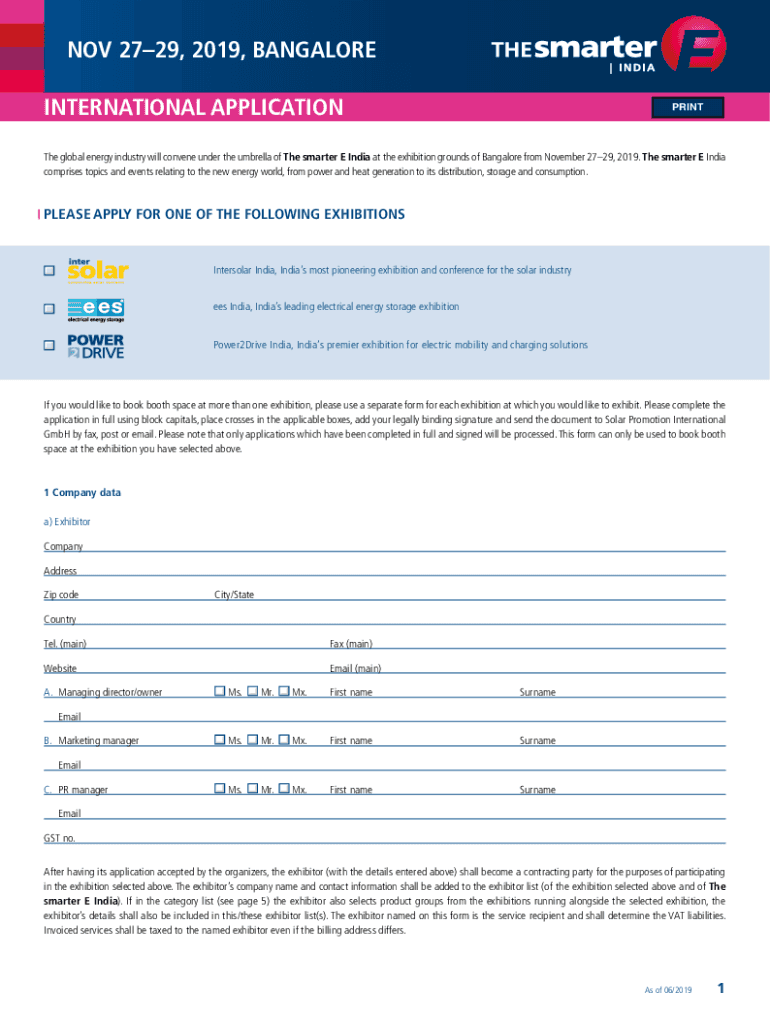 NOV 2729, 2019, BANGALOREINTERNATIONAL APPLICATIONPRINTThe global energy industry will convene under the umbrella of The smarter E India at the exhibition grounds of Bangalore from November 2729,