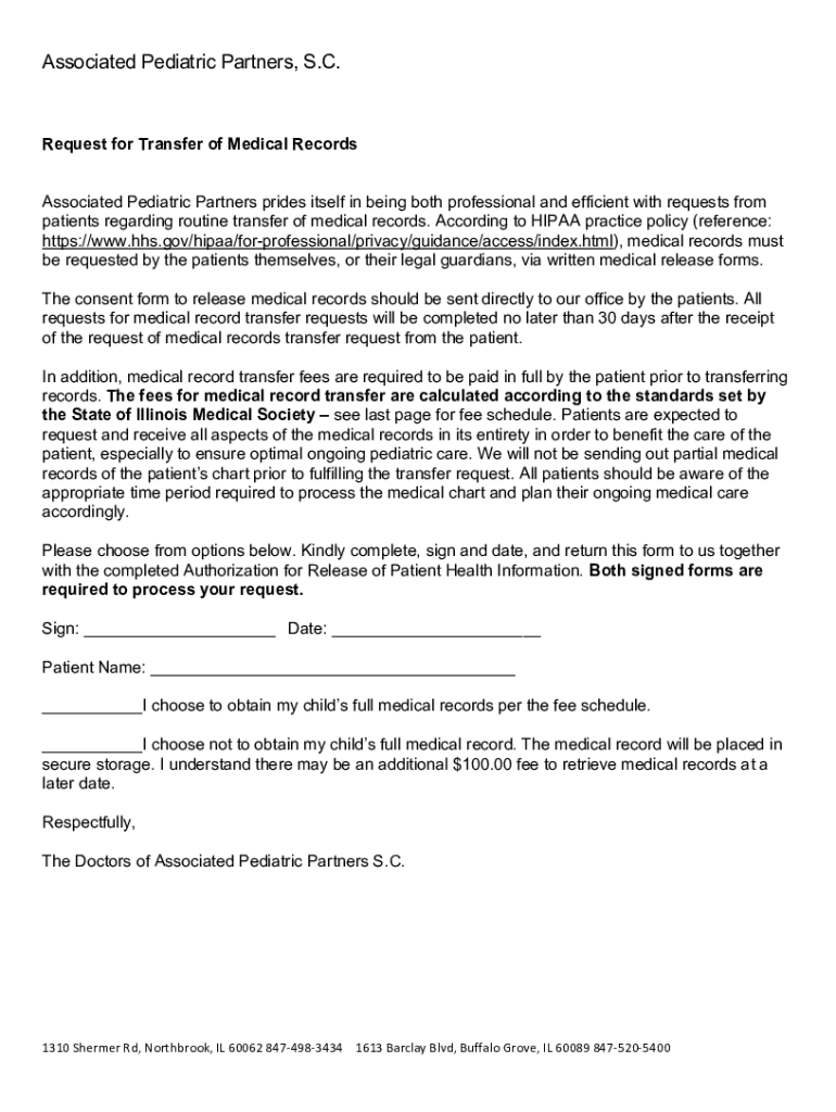 Associated Pediatric Partners, S.C. Request for Transfer of Medical Records
