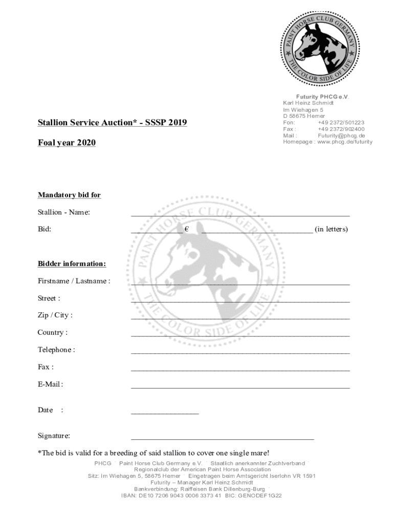 Futurity HCG e.V. Karl Heinz Schmidt I'm Weaken 5 D 58675 Homer For: +49 2372/501223 Fax : +49 2372/902400 Mail : Futurity fog.DE Homepage : www.phcg.de/futurityStallion Service Auction* SSP 2019