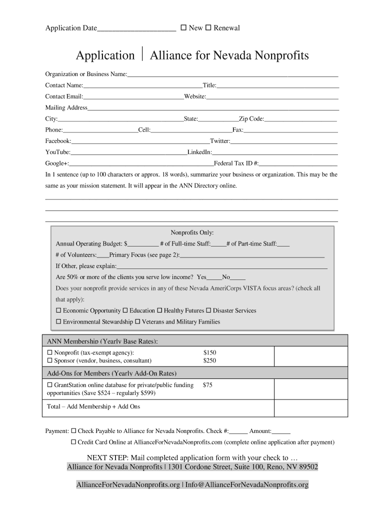 Get the free BApplicationb Alliance for Nevada Nonprofits - ANN Alliance for bb