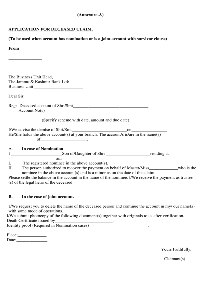Eligibility for the Deceased Claim Application typically includes legal heirs, beneficiaries named in trust documents, or individuals listed as joint account holders. Always check with The Jammu & Kashmir Bank for specific eligibility criteria.