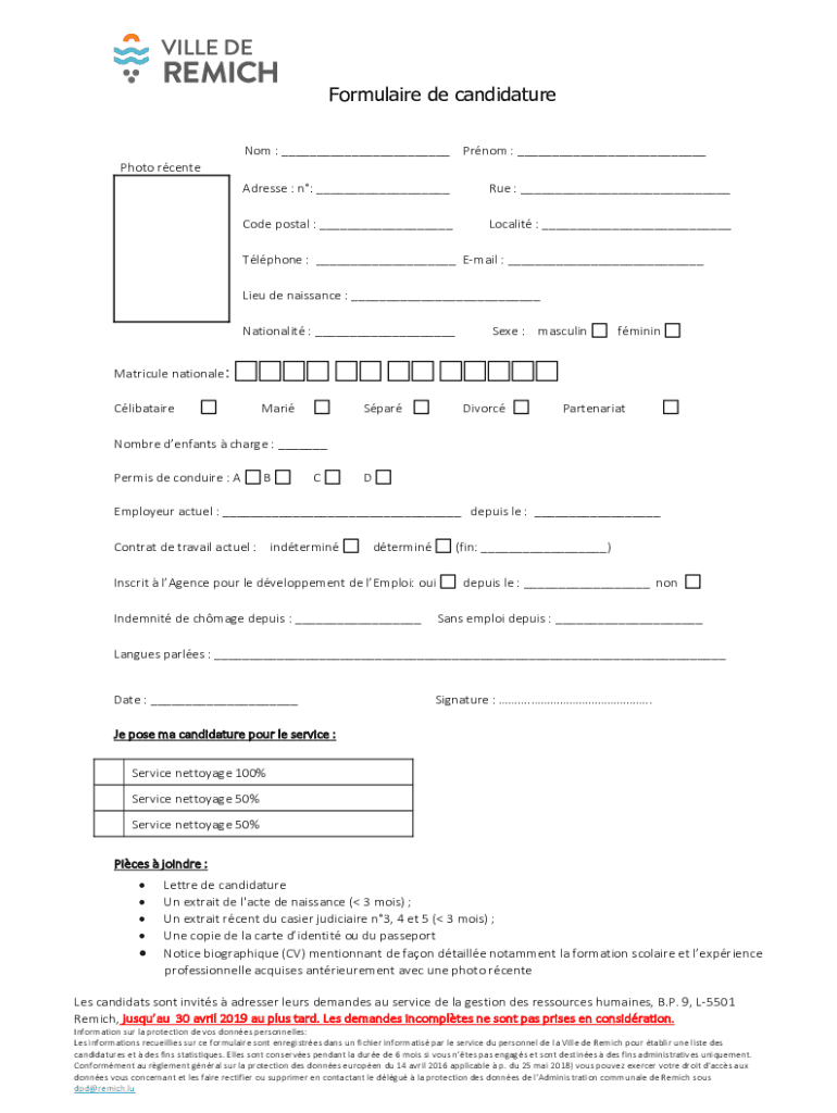 Formula ire DE candidature Not : Prom : Photo center Address : n: Rue : Code postal : Locality : Tl phone : Email : Lieu de Renaissance : Nationalist : See : masculinfmininMatricule national: ClibataireMariSparDivorcPartenariatNombre