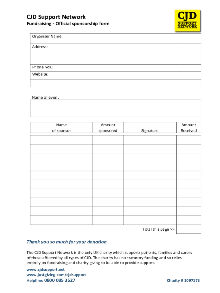 CD Support NetworkFundraising Official sponsorship formOrganiser Name:Address:Phone nos.:Website:Name of eventAmountsponsoredNameof sponsorSignatureAmountReceivedTotal this page Thanks you so much