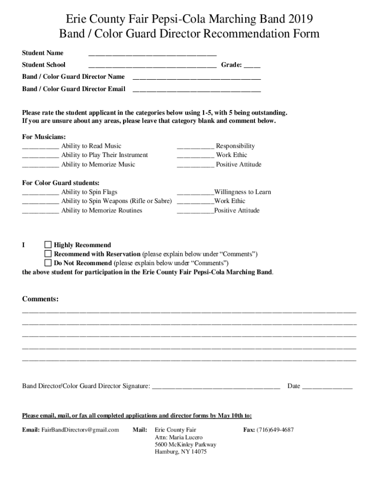 Erie County Fair Pensacola Marching Band 2019 Band / Color Guard Director Recommendation Form Student Name Student School Grade: Band / Color Guard Director Name Band / Color Guard Director Email