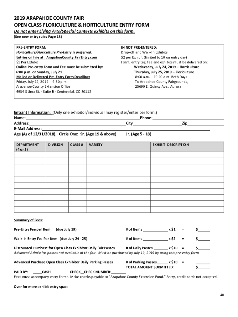 2019ARAPAHOECOUNTYFAIR OPENCLASSFLORICULTURE&HORTICULTUREENTRYFORM DonotenterLivingArts/SpecialContestsexhibitsonthisform. (SeenewentryrulesPage18) PREENTRYFORM: Horticulture/FloriculturePreEntryispreferred.