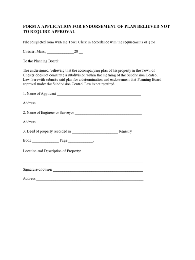FORM A APPLICATION FOR ENDORSEMENT OF PLAN BELIEVED NOT TO REQUIRE APPROVAL File completed form with the Town Clerk in accordance with the requirements of 21. Chester, Mass., 20 To the Planning Board: