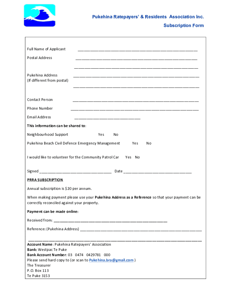 Pushing Ratepayers & Residents Association Inc. Subscription Formula Name of Applicant Postal Address Pushing Address (If different from postal) Contact Person Phone Number Email Address This information