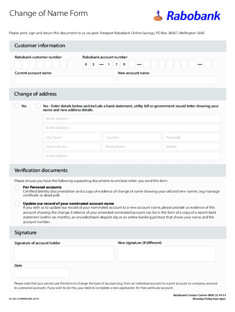 Change of Name Form Please print, sign and return this document to us via post: Free post Rabobank Online Savings, PO Box 38567, Wellington 5045Customer information Rabobank customer numberRabobank