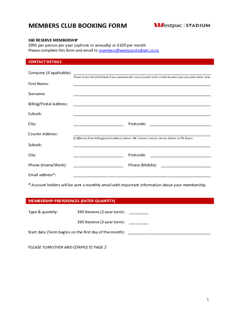 MEMBERS CLUB BOOKING FORM 360 RESERVE MEMBERSHIP $995 per person per year (upfront or annually) or $100 per month Please complete this form and email to members westpacstadium.co.NZ CONTACT DETAILS