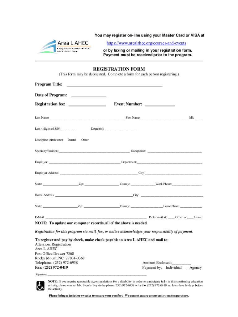 You may register online using your Master Card or VISA HTTPS://www.arealahec.org/coursesandevents or by faxing or mailing in your registration form. Payment must be received prior to the program.