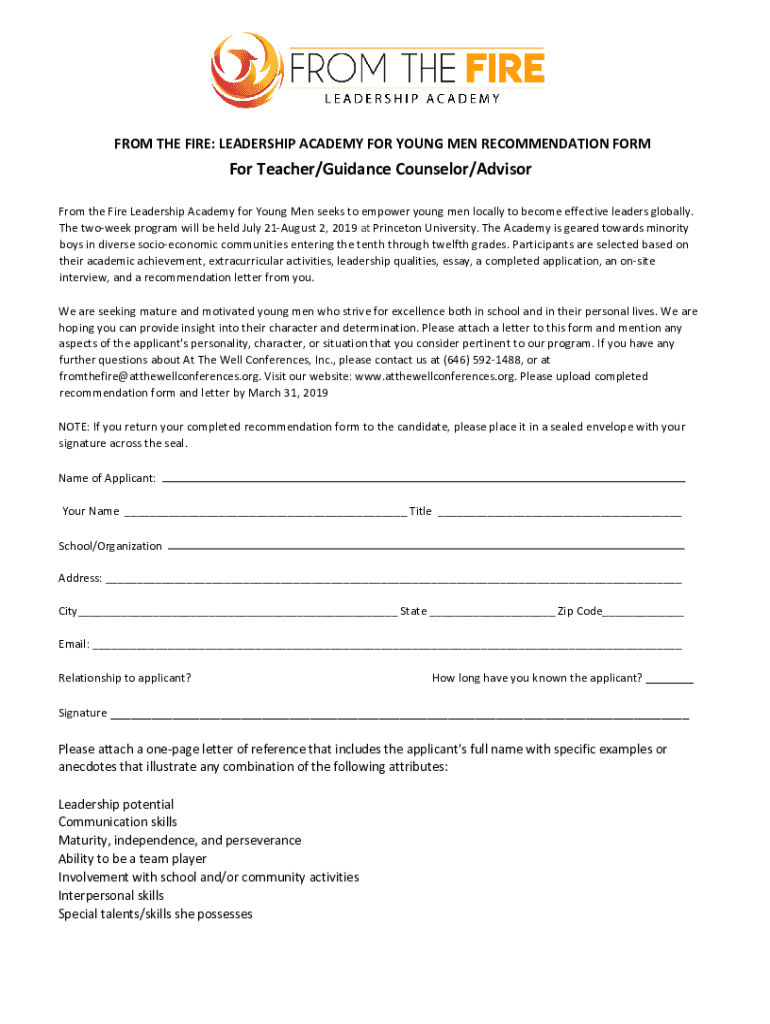 FROM THE FIRE: LEADERSHIP ACADEMY FOR YOUNG MEN RECOMMENDATION Former Teacher/Guidance Counselor/Advisor