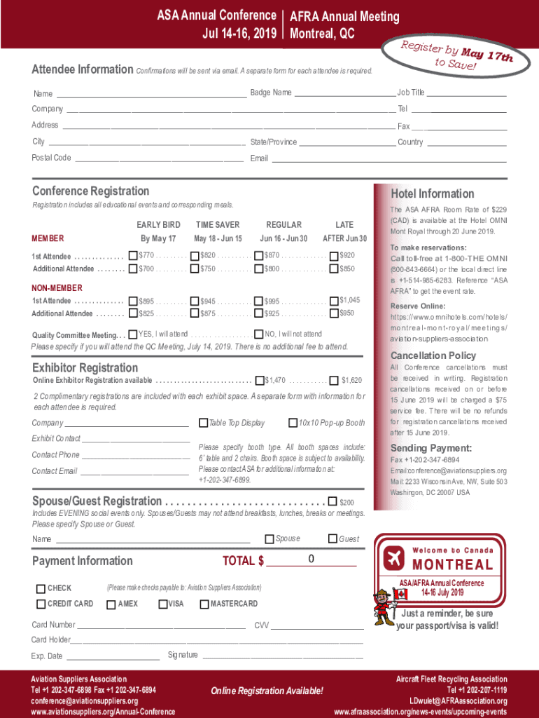 ASA Annual Conference AFRO Annual Meeting Jul 1416, 2019 Montreal, QCRegisterby May 1 7th to Save! Attendee Information Confirmations will be sent via email. A separate form for each attendee is required.