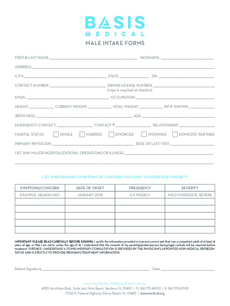 MALE INTAKE FORMS FIRST & LAST NAME: NICKNAME: ADDRESS: CITY: STATE: ZIP: CONTACT NUMBER: DRIVER LICENSE NUMBER: (copy is required at checking) EMAIL: OCCUPATION: HEIGHT: CURRENT WEIGHT: GOAL WEIGHT: