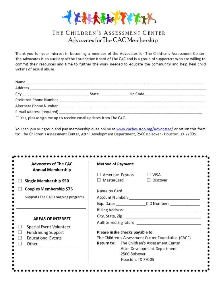 THE CHILDREN ASSESSMENT CENTERAdvocates for The CAC MembershipThank you for your interest in becoming a member of the Advocates for The Children's Assessment Center. The Advocates are an auxiliary