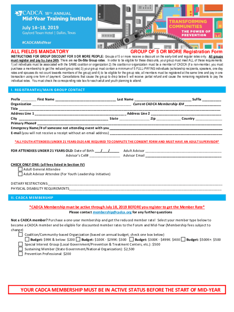 ALL FIELDS MANDATORYGROUP OF 5 OR MORE Registration FormINSTRUCTIONS FOR GROUP DISCOUNT FOR 5 OR MORE PEOPLE: Groups of 5 or more receive a discount on the early bird and regular rates only. All groups